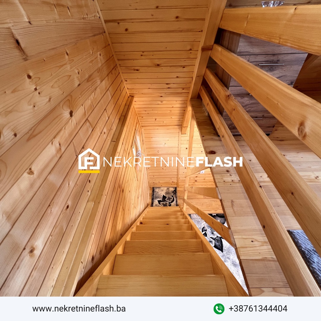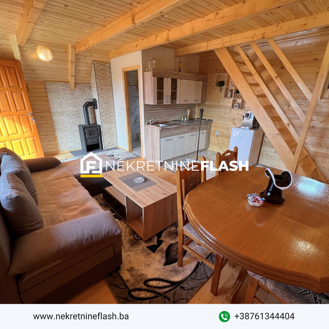 Vikend objekat dimenzija 5.0 m x 6. 0m, stambene površine 46.80 m², tlocrtne površine 30 m², spratnosti Pr+Pot, zajedno sa uređenim dvorištem i okućnicom, smješten je na ograđenoj parceli ukupne površine 411 m². Vrlo praktičnog i funkcionalnog je rasporeda. Strukturu objekta čine dnevni boravak sa kuhinjom i trpezarijom te kupatilom u prizemlju, zatim spavaća soba sa ukupno 3 kreveta i balkonom u potkrovlju objekta.