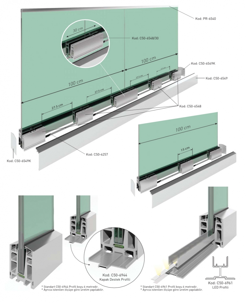 Alternativno rješenje sa tačkastim nosačima. Sistem AL50 nudi inovativno rješenje gdje se stakla pričvršćuju pomoću tačkastih nosača, omogućavajući čist pogled bez ikakvih prepreka. Ovaj sistem je idealan za stakla debljine 16-20 mm, pružajući sigurnost i estetiku.
